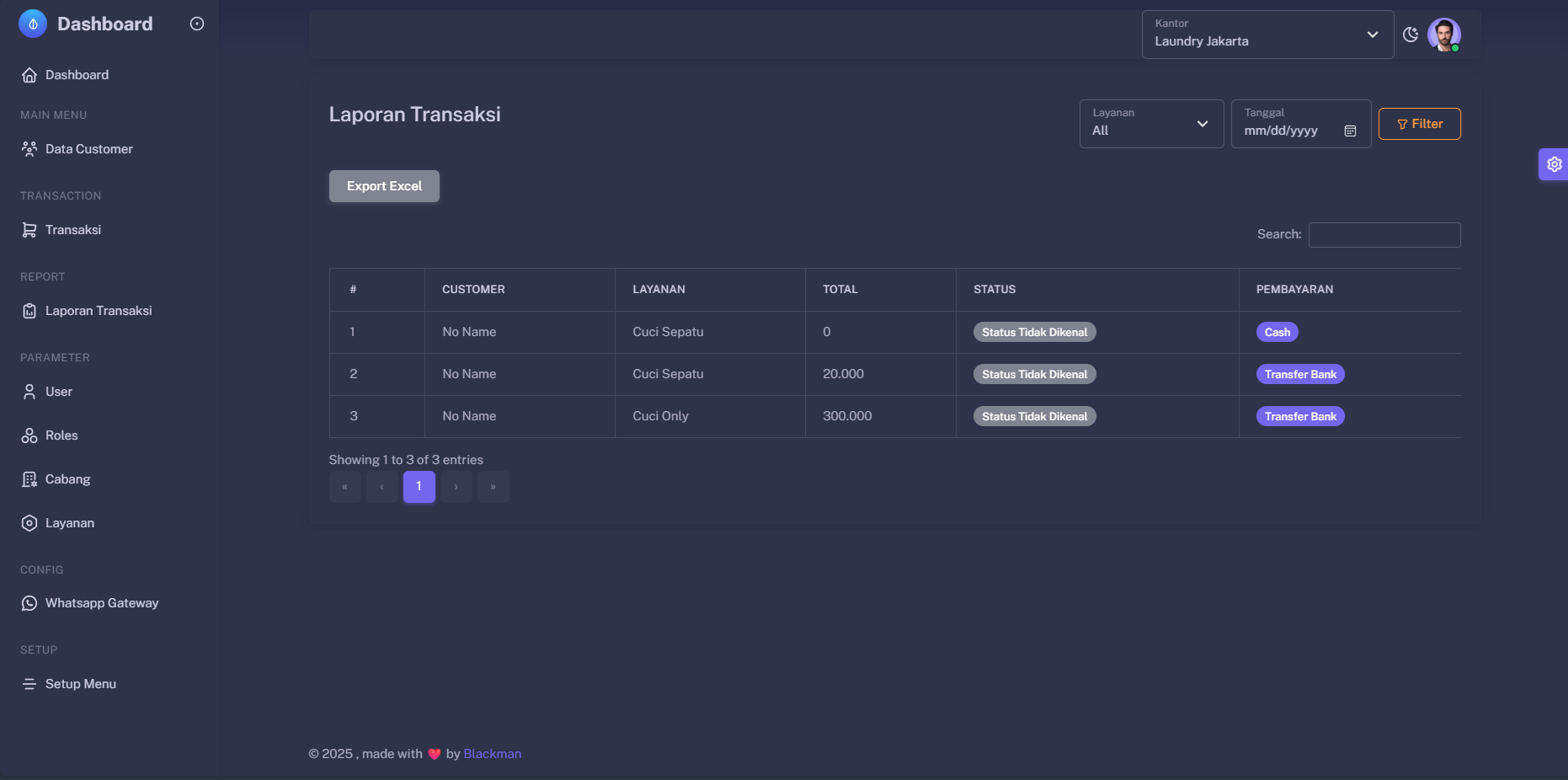 Pelanggan cukup buka website, pilih outlet, tentukan layanan, dan mereka bisa pantau status cucian langsung dari browser.