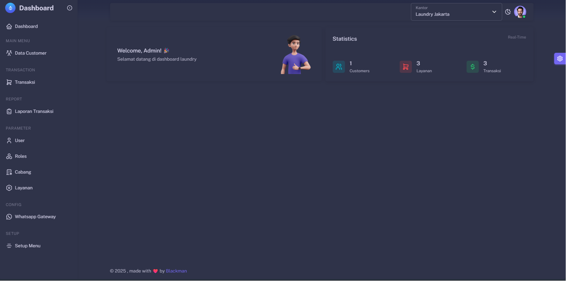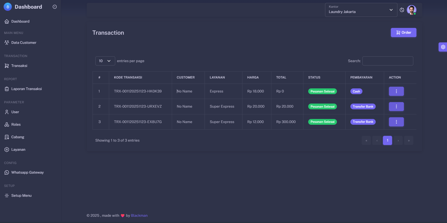 Pelanggan cukup buka website, pilih outlet, tentukan layanan, dan mereka bisa pantau status cucian langsung dari browser.
